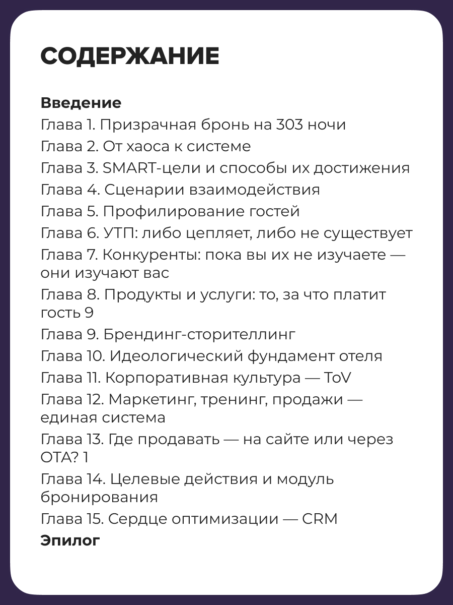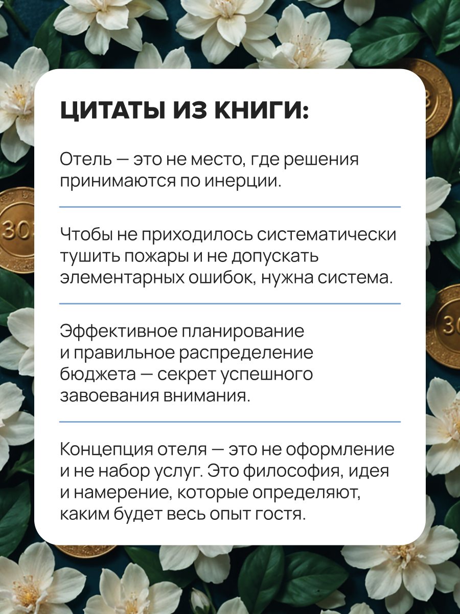 Это даже не книга, а рабочая тетрадь, к которой вы будете возвращаться снова и снова. Каждая ее глава — это блок системы управления отелем, в котором конкретные инструменты, а не абстрактные советы. Изучив и применив их на практике, вы пересоберете процессы в отеле, найдете и устраните утечки в маркетинге, продажах, сервисе и управлении. Команда начнет работать осознанно. Вы превратите хаос в систему и начнете наконец управлять, а не тушить пожары.
