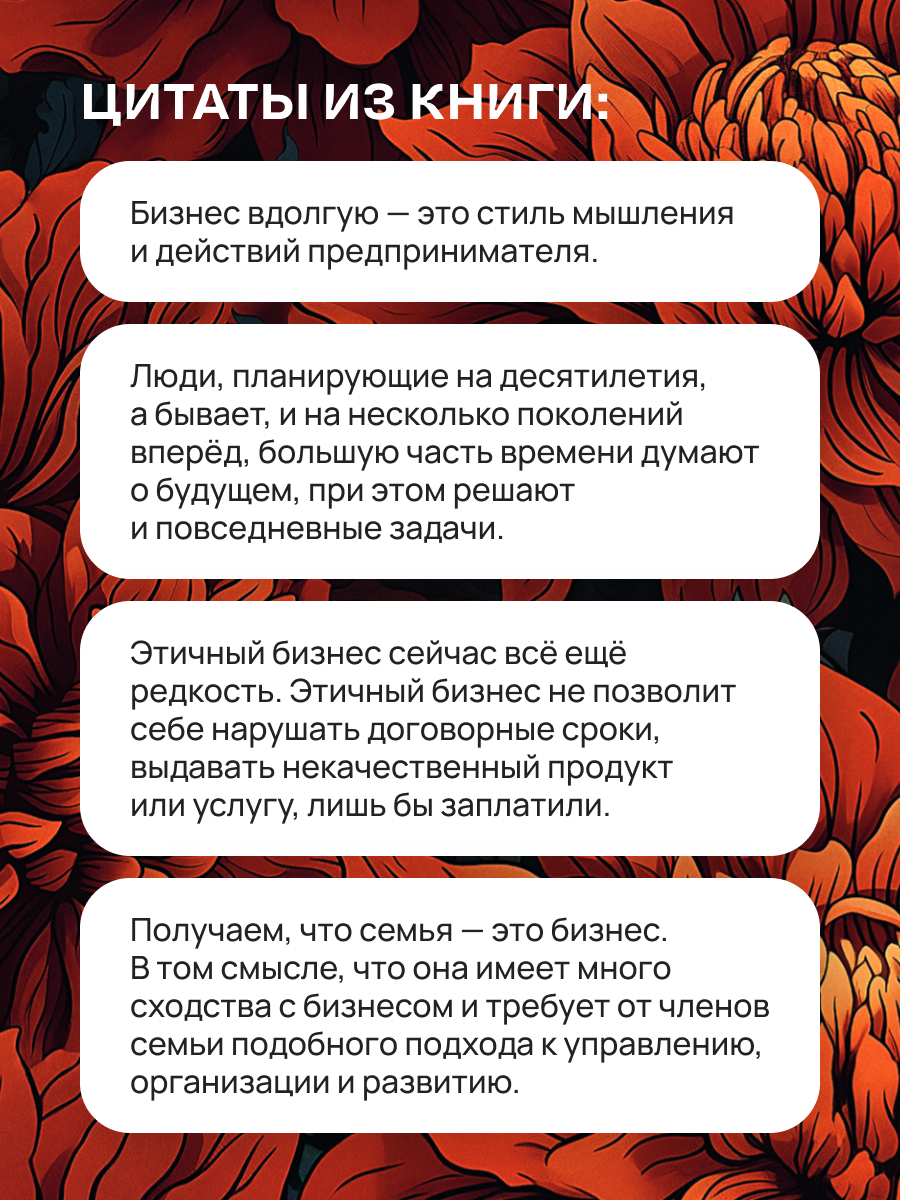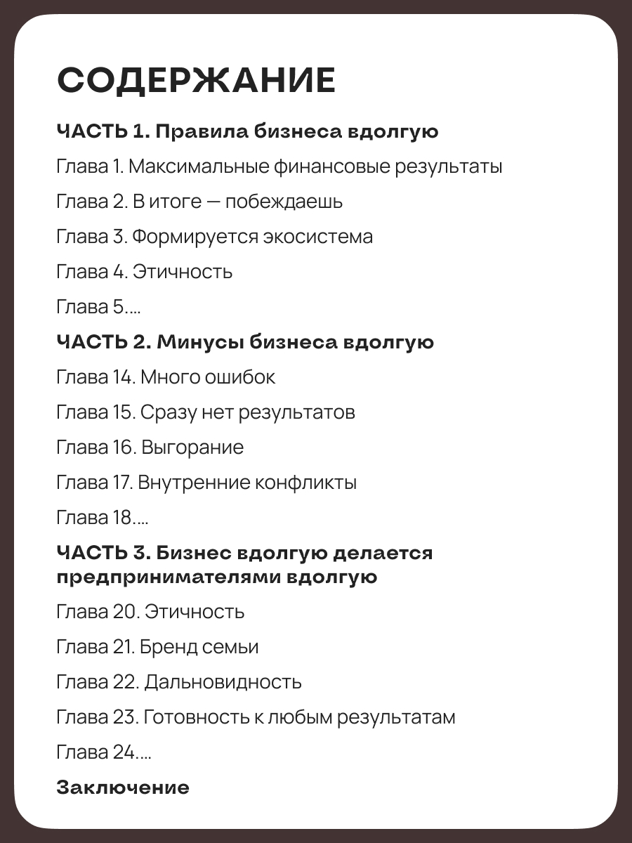 Узнать большеЭта книга — путеводитель для тех, кто стремится создать успешный бизнес, ориентированный на долгосрочную перспективу, а не на мгновенную прибыль. Автор делится секретами построения устойчивого бизнеса, основанного на постоянном развитии, терпении и приверженности высоким стандартам. Читатели узнают, почему важно фокусироваться на стратегическом мышлении, планировать далеко вперед и вкладываться в создание прочной основы своего дела. Ключ к успеху заключается в ежедневном улучшении процессов, внимательном отношении к деталям и готовности преодолевать трудности ради высоких целей. «Бизнес вдолгую» вдохновляет предпринимателей ставить амбициозные цели, верить в собственные силы и стремиться к постоянному росту. Эта книга станет ценным ресурсом для всех, кто хочет построить надежный и процветающий бизнес, способствующий повышению качества собственной жизни и жизни окружающих.
